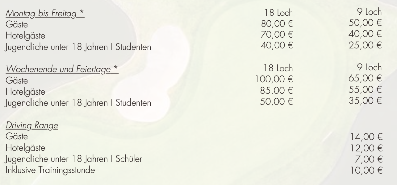 Das 18 Loch Greenfee versteht sich pro 18 Loch Runde, die Nutzung der Driving