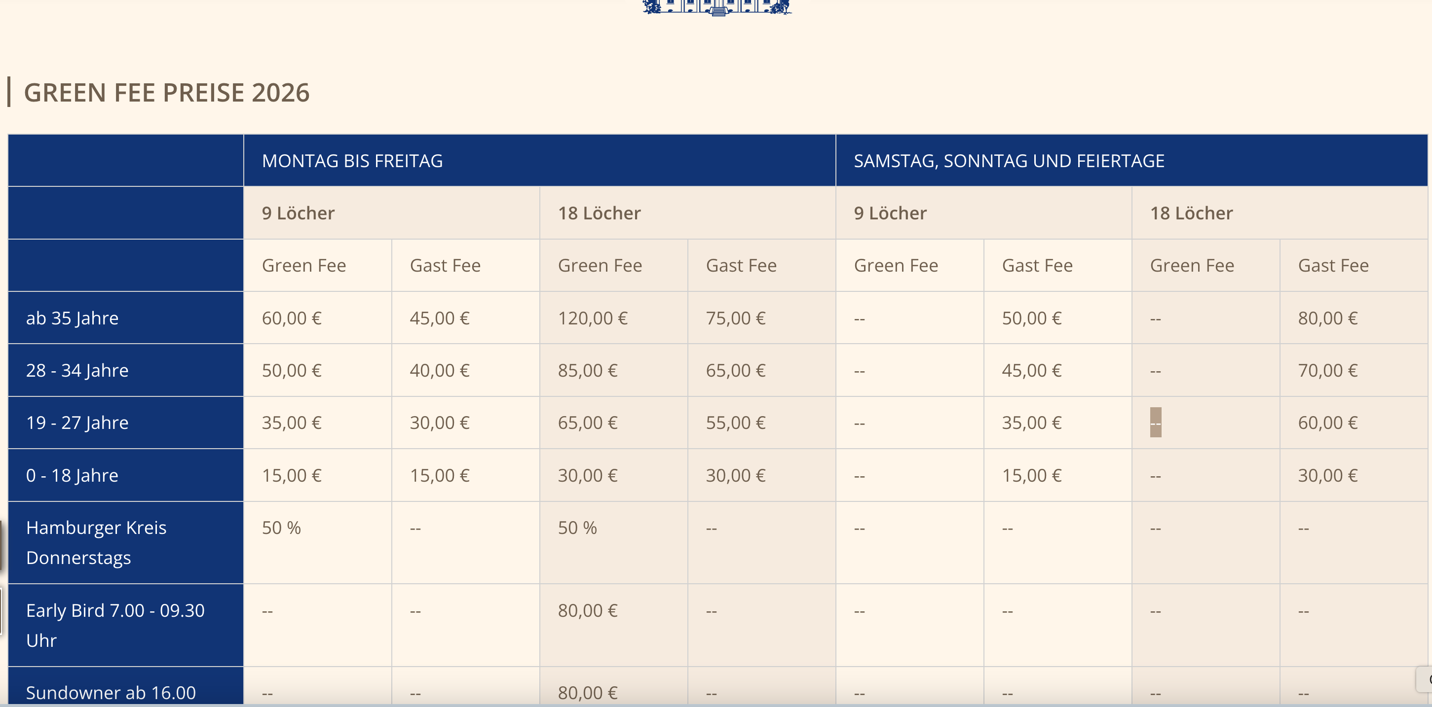 An Wochenenden und Feiertagen ist das Spielen den Mitgliedern, deren Gästen und Hotelgästen vorbehalten.